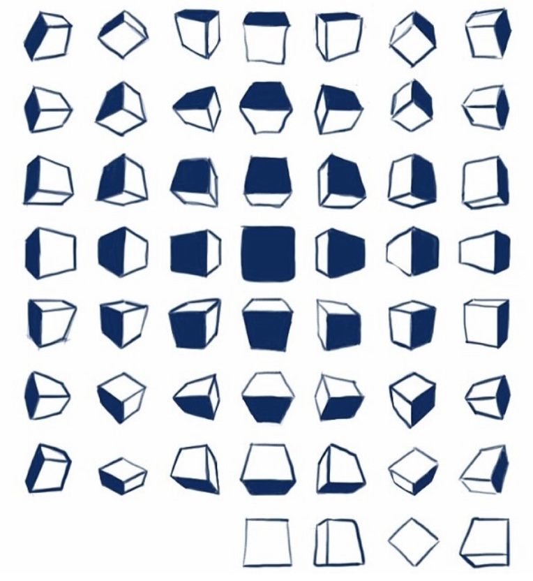 The length of my lines is key in presenting a different perspective. I observed this with the 1-down, 2-left cube where the leftmost edge has to be shorter to allow the left-bottom edge to connect diagonally down toward the middle.